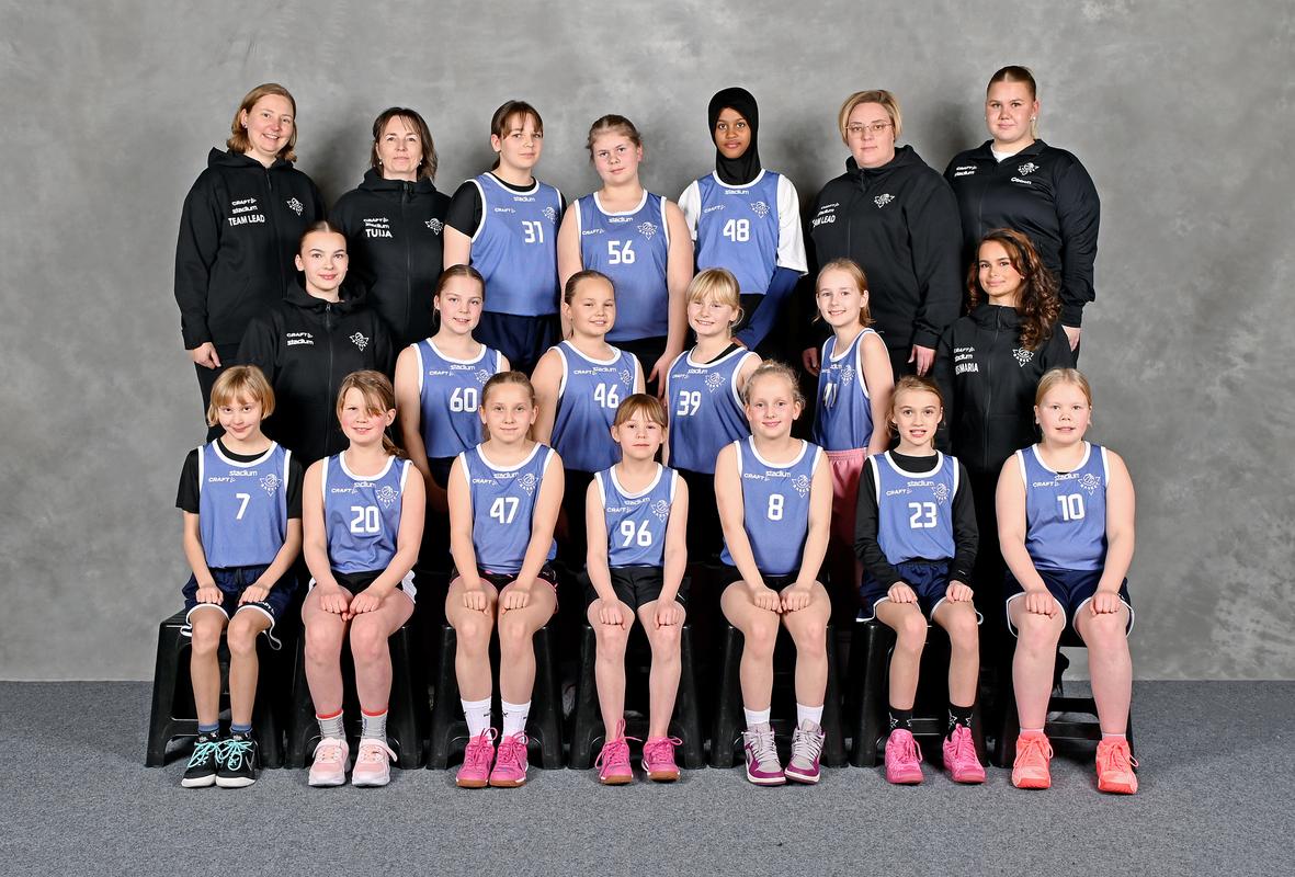 Minityttöjen joukkue harjoittelee koripallon perustaitoja kaksi kertaa viikossa.